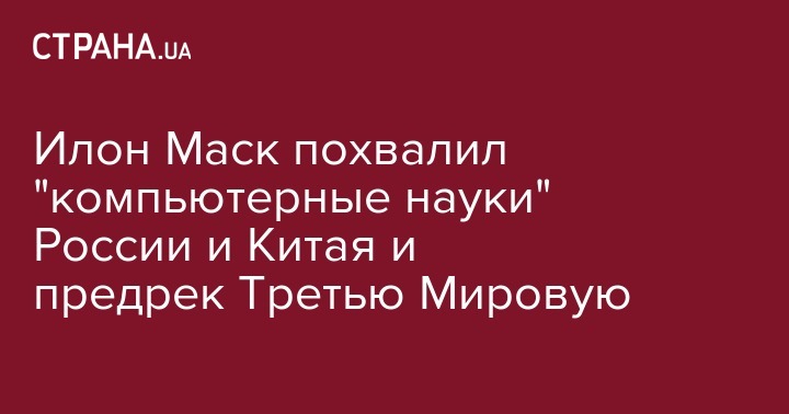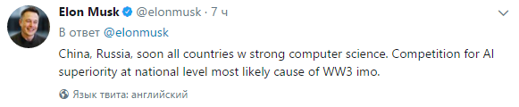 "Началось... Китай, Россия, а потом и все страны, которые сильны в компьютерных науках. Конкуренция за превосходство в сфере искусственного интеллекта на национальном уровне – наиболее вероятная причина начала Третьей мировой войны", – написал он в Twitter.