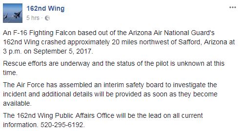 В американском штате Аризона разбился истребитель F-16 Национальной гвардии. Об этом говорится сообщении части 162-го отряда Национальной гвардии в Facebook.