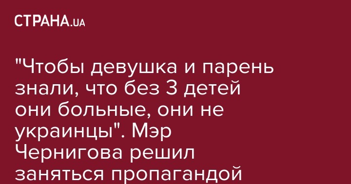 "Через все меньшинства, а у нас их 23, там есть руководители, которые имеют авторитет. Через учителей, врачей, каких-либо людей, которые имеют авторитет для общества, это то, что каждая семья, если мы патриоты, то патриотизм должен быть выражен не только в словах и геополитических отношениях. Если брать патриотическую составляющую, чтобы минимум 3 ребенка в семье. Чтобы девушка и парень, они вырастали и знали, что если у них не будет 3 детей, значит они больные, какие-то не такие, они вообще не украинцы. Это очень серьезный вопрос, он чувствительный, над этим нужно работать", - заявил мэр Чернигова.