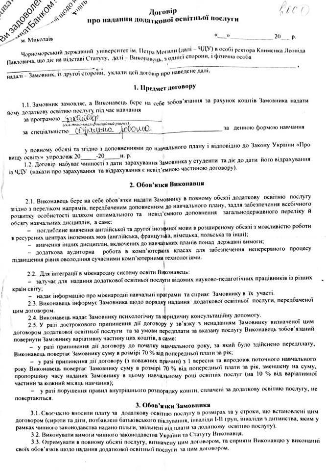 Администрация Черноморского национального университета им. П. Могилы "добровольно принудительно" заключает со студентами договора на дополнительные образовательные услуги, за которые необходимо заплатить 3 тысячи гривен. Отстоять права студентов пообещало Молодежное антикоррупционное агентство, передает сайт Николаева.