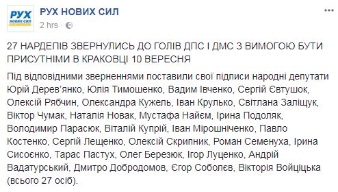 "Под соответствующими обращениями поставили свои подписи народные депутаты Юрий Деревянко, Юлия Тимошенко, Вадим Ивченко, Сергей Евтушок, Алексей Рябчин, Александра Кужель, Иван Крулько, Светлана Залищук, Виктор Чумак, Наталья Новак, Мустафа Найем, Ирина Подоляк, Владимир Парасюк, Виталий Куприй, Иван Мирошниченко, Павел Костенко, Сергей Лещенко, Алексей Скрипник, Роман Семенуха, Ирина Сисоенко, Тарас Пастух, Олег Березюк, Игорь Луценко, Андрей Вадатурский, Дмитрий Добродомов, Егор Соболев, Виктория Войцицкий (всего 27 человек)", - говорится в сообщении.