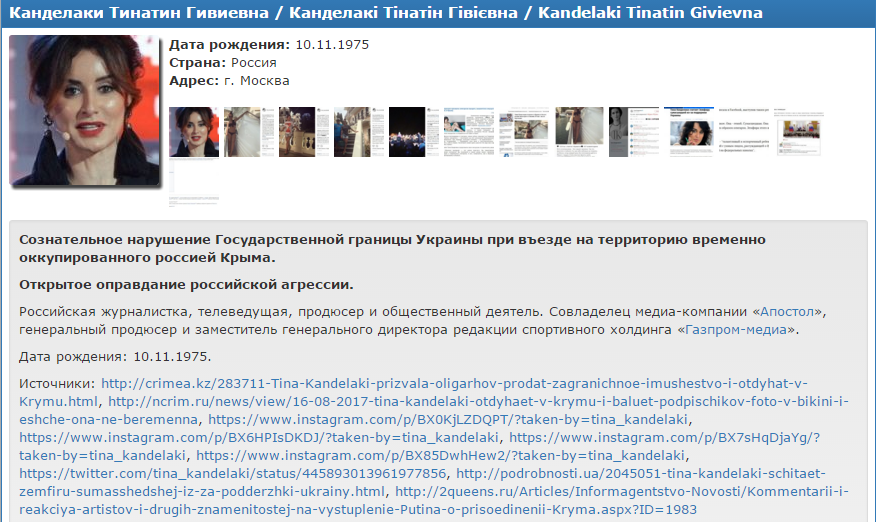 "Сознательное нарушение Государственной границы Украины при въезде на территорию временно оккупированного Россией Крыма, открытое оправдание российской агрессии", - так стандартно поясняется причина занесения Канделаки в "черный список".