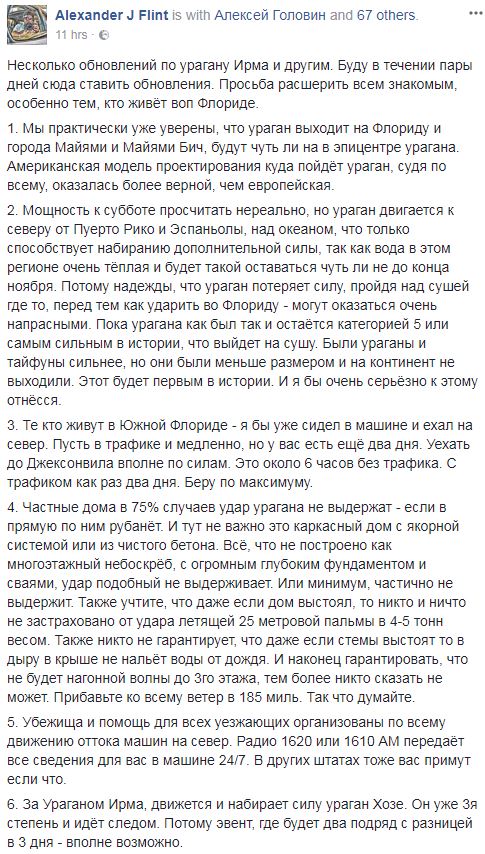 "Мощность к субботе просчитать нереально, но ураган двигается к северу от Пуэрто-Рико и Эспаньолы, над океаном, что только способствует набиранию дополнительной силы, так как вода в этом регионе очень теплая и будет такой оставаться чуть ли не до конца ноября. Потому надежды, что ураган потеряет силу, пройдя над сушей, перед тем как ударить по Флориде - могут оказаться напрасными. Ураган остается в категории 5, или самым сильным в истории, что выйдет на сушу", - отметил местный житель Александр Флинтю. Он добавил, что были ураганы и тайфуны сильнее, но они были меньше размером и на континент не выходили.