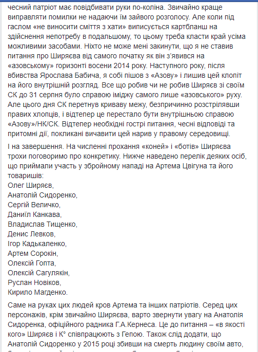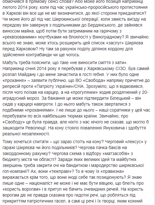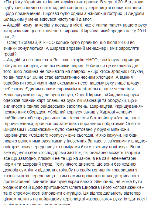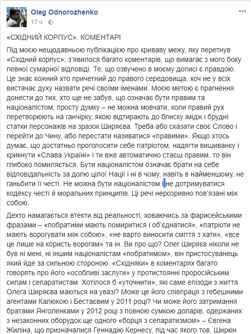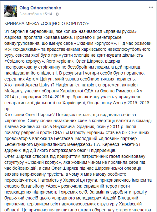"Олег Ширяев создал под прикрытием патриотических лозунгов военизированную структуру "Восточный корпус", которая никоим образом не проявила себя во время боевых действий. Зато в Харькове эта группа, прикрываясь именем и славой батальона "Азов", начала настоящий террор против незащищенных предприятий и отдельных лиц", - пишет Однороженко.