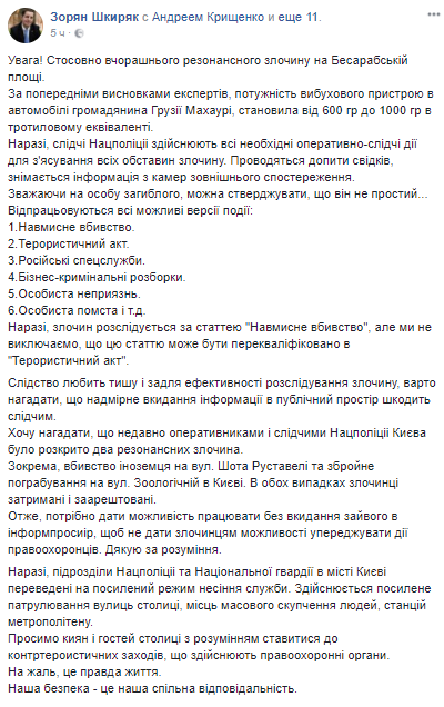Нацполиция назвала шесть версий взрыва автомобиля в результате которого погиб гражданин Грузии Али Тимаева (Тимура Махаури) в центре Киева. Об этом сообщил советник министра внутренних дел Зорян Шкиряк на своей странице в Facebook.