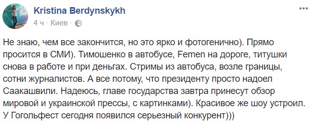 Журналистка Кристина Бердинских нашла в происходящем профессиональный аспект позитива. "Не знаю, чем все закончится, но это ярко и фотогенично). Прямо просится в СМИ). Тимошенко в автобусе, Femen на дороге, титушки снова в работе и при деньгах. Стримы из автобуса, возле границы, сотни журналистов. А все потому, что президенту просто надоел Саакашвили. Надеюсь, главе государства завтра принесут обзор мировой и украинской прессы, с картинками). Красивое же шоу устроил. У Гогольфест сегодня появился серьезный конкурент", - подчеркнула она.