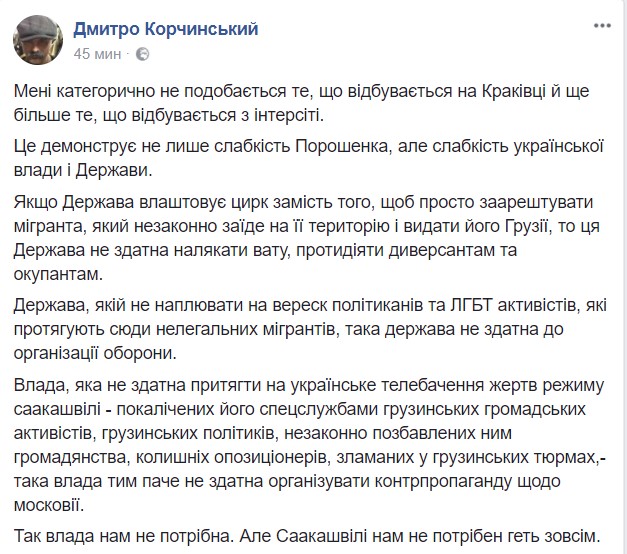 "Мне категорически не нравится то, что происходит на Краковце, но еще более - о, что творится с Интерсити. Это демонстрирует не только слабость Порошенко, но и слабость украинской власти и государства. Если государство устраивает цирк вместо того, чтобы просто арестовать мигранта, который незаконно заезжает на его территорию и выдать его Грузии, то это государство не может напугать вату, противодействовать диверсантам и оккупантам", - уверен Корчинский. По его словам, действующая власть Украины "нам не нужна, но Саакашвили не нужен нам вообще".
