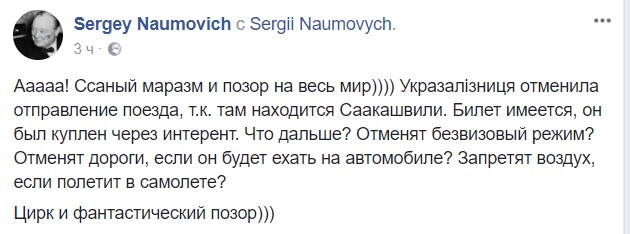 "Ааааа! С@@ный маразм и позор на весь мир)))) Укразалізниця отменила отправление поезда, т.к. там находится Саакашвили. Билет имеется, он был куплен через интернет. Что дальше? Отменят безвизовый режим? Отменят дороги, если он будет ехать на автомобиле? Запретят воздух, если полетит в самолете? Цирк и фантастический позор", - констатирует Наумович.