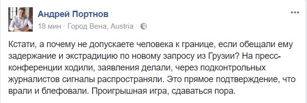 После того, как стало известно о попытке властей Украины закрыть границу в пункте пропуска "Шегени" для пересечения его Саакашвили, Портнов напомнил, что ранее силовые ведомства официально заявляли о готовности впустить Михо, чтобы затем начать процедуру его экстрадиции в Грузию. Вместо этого его просто не пропускают в Украину.