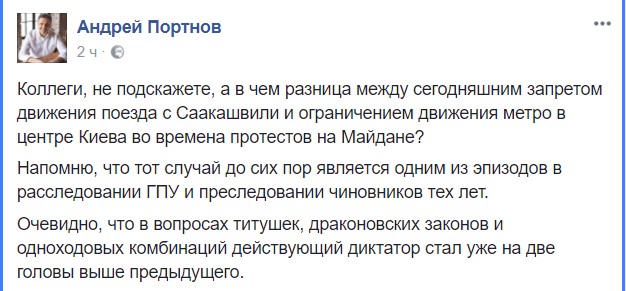 "Коллеги, не подскажете, а в чем разница между сегодняшним запретом движения поезда с Саакашвили и ограничением движения метро в центре Киева во времена протестов на Майдане? Напомню, что тот случай до сих пор является одним из эпизодов в расследовании ГПУ и преследовании чиновников тех лет. Очевидно, что в вопросах титушек, драконовских законов и одноходовых комбинаций действующий диктатор стал уже на две головы выше предыдущего", - написал Портнов.