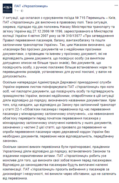 "ПАО "Укрзализныця" делает все возможное для того, что выполнить свои обязательства перед пассажирами. В соответствии с законодательством пассажирам будут выплачены положенные компенсации. ПАО "Укрзализныця" просит прощения у пассажиров за дискомфорт и неудобства, которые возникли из-за обстоятельств, не зависящих от перевозчика", - говорится в сообщении.