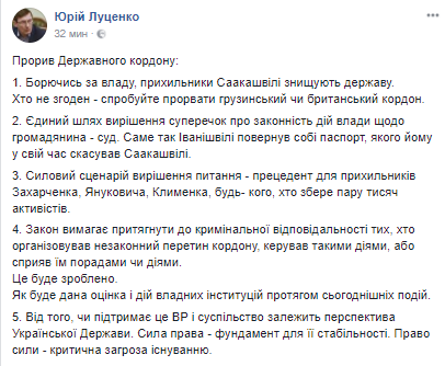 Генпрокурор Юрий Луценко отреагировал на сегодняшний прорыв Михаила Саакашвили через польско-украинскую границу. Он считает, что борясь за власть сторонники Михаила Саакашвили уничтожают государство. Об этом он написал на своей странице в Facebook.