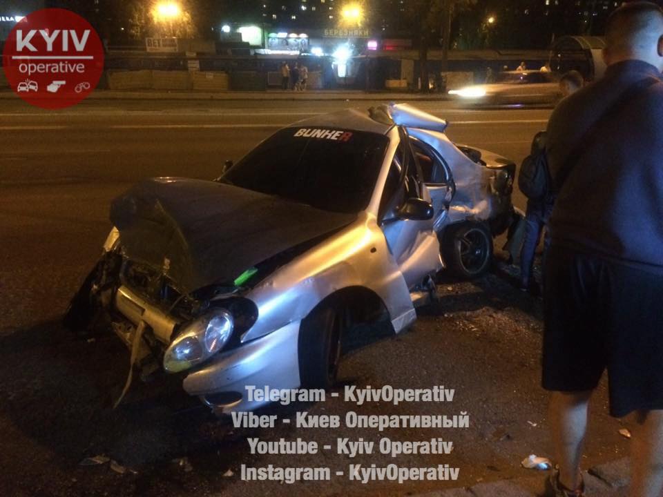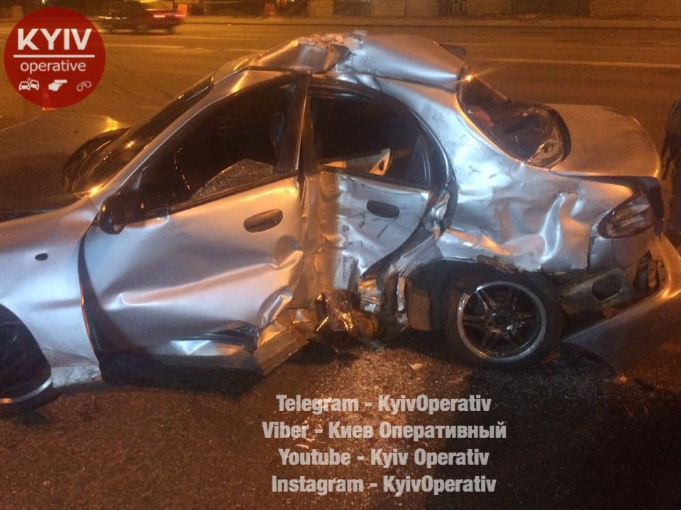 Поздно вечером в Киеве Daewoo Lanos из-за прокола колеса стал неуправляемым и спровоцировал сразу несколько ДТП. Об этом сообщается на портале dtp.kiev.ua в Facebook.