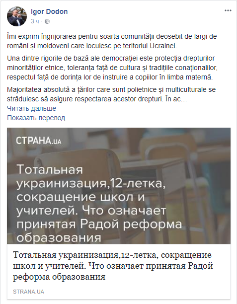 "Как президент Республики Молдова, обращаюсь к киевской власти с призывом пересмотреть свою новую политику в отношении этнокультурных меньшинств. Напоминаю им, что в Молдове права украинской общины придерживаются", - отметил Додон, репостнув статью "Страны" про реформу образования.