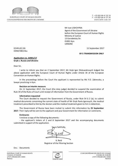По словам министра, рассмотрев представленные материалы, 11 сентября ЕСПЧ принял решение об отложении рассмотрения вопроса о применении правила 39 Регламента Европейского суда до получения необходимой информации от правительства России.
