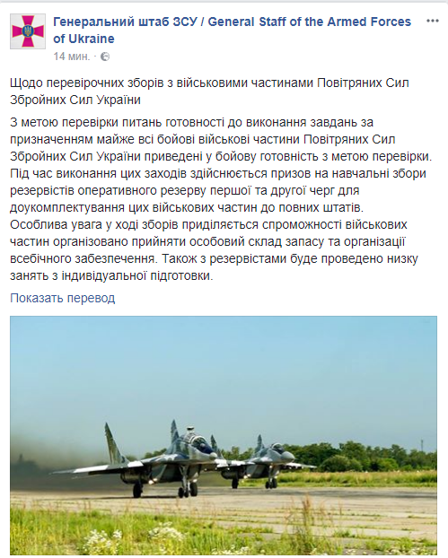 Практически все боевые воинские части Воздушных сил Вооруженных сил Украины приведены в боевую готовность для проверки. Об это сообщает Генеральный штаб ВСУ в Facebook.