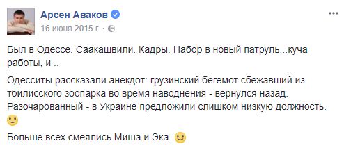 А вот глава МВД Арсен Аваков сразу начал подшучивать над Саакашвили. После поездки в Одесскую область, уже через две недели после назначения экс-президента Грузии, он рассказал в Facebook анекдот: "Грузинский бегемот сбежавший из тбилисского зоопарка во время наводнения — вернулся назад. Разочарованный — в Украине предложили слишком низкую должность".
