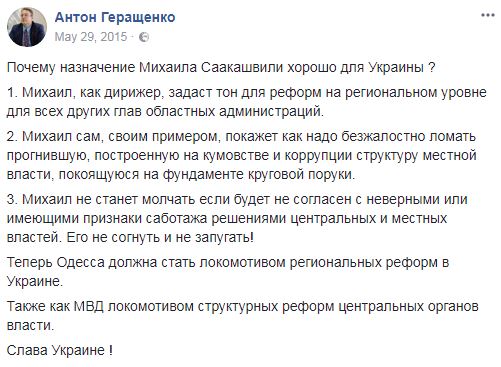 Народный депутат и советник главы МВД Антон Геращенко, который сейчас грозит Михо уголовным делом, также активно поддерживал назначение Саакашвили в 2015 году. Он написал пост в Facebook, объясняя, почему назначение Михо позитивно для Украины.