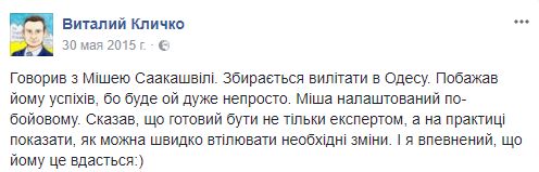 Мэр Киева Виталий Кличко пожелал успехов Михаилу Саакашвили. "Говорил с Мишей Саакашвили. Собирается вылетать в Одессу. Пожелал ему успехов, так как будет ему ой не просто", - написал Кличко в Facebook. "Миша настроен по-боевому. Сказал, что готов быть не только экспертом, а на практике показать, как можно быстро воплощать необходимые изменения. И я уверен, что ему это удастся", - добавил мэр Киева.