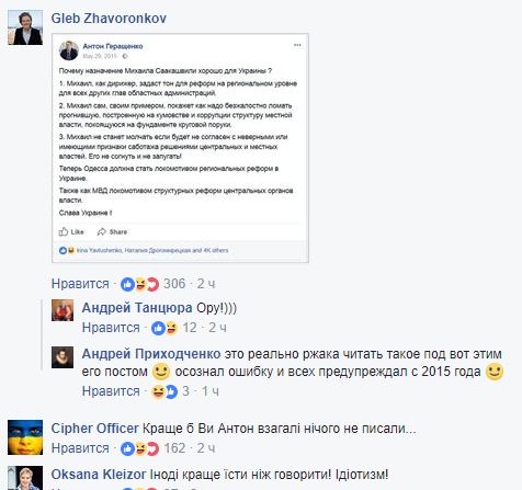 "Я также, как и многие, был среди тех, кто заблуждался в отношении Саакашвили в первые месяцы его назначения. Однако позже я понял, что он несет угрозу для Украины и последовательно являлся его оппонентом. Я умею признавать свои ошибки и призываю сделать тоже самое других украинских политиков, которые хотят процветания Украине", - дописал советник Авакова.