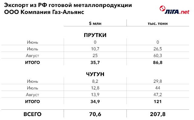 Компания "Газ-Альянс" экспортирует горячекатаные и кованые прутки, а также нелегированный чугун. С июня по сентябрь на экспорт было поставлено около 121 тысячи тонн чугуна на сумму 34,9 млн долларов, а также около 86,8 тысяч тонн прутков на сумму 35,7 млн.