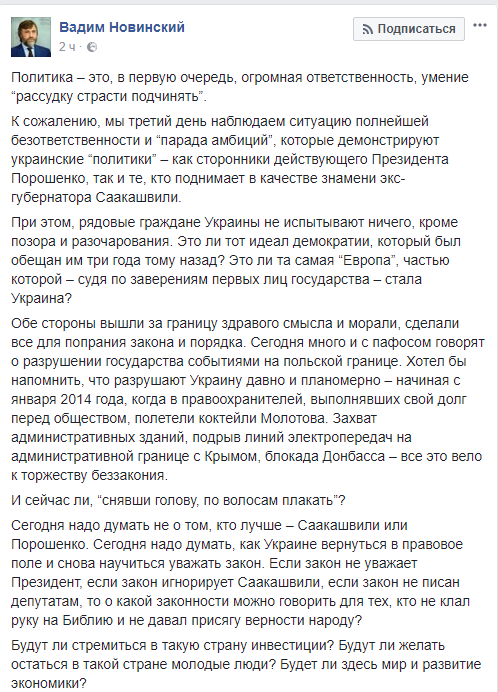 "Оппозиционный блок" в конфликте Михаила Саакашвили с действующей власти критикует обе стороны. Нардеп Вадим Новинский в Facebook заявил, что и противники и сторонники Михо "вышли за границу здравого смысла и морали".