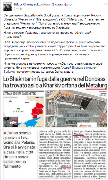 "Сегодняшняя Gazzetta dello Sport указала Крым территории России. При этом автор материала Пьерфранческо Аркетти вещает прямо из Харькова", - пишет он.