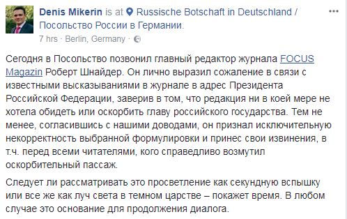 Главный редактор журнала Focus Роберт Шнайдер позвонил в посольство РФ в Германии с извинениями по поводу появления на страницах издания некорректных формулировок по отношению к российскому президенту Владимиру Путину. Об этом в Facebook сообщил пресс-атташе посольства Денис Микерин.