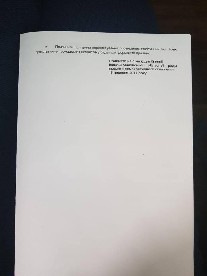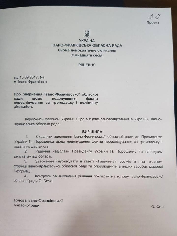 Ивано-Франковский областной совет принял проект обращения к президенту Украины Петру Порошенко по недопущению преследования политиков и активистов в Украине.