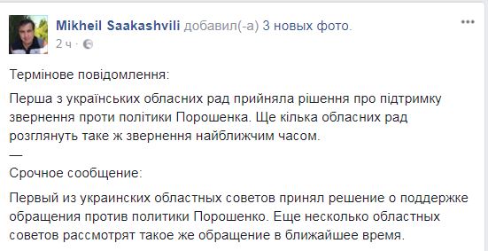 "Первый из украинских областных советов принял решение о поддержке обращения против политики Порошенко. Еще несколько областных советов рассмотрят такое же обращение в ближайшее время", - написал он на своей странице и опубликовала фотографии принятого документа.