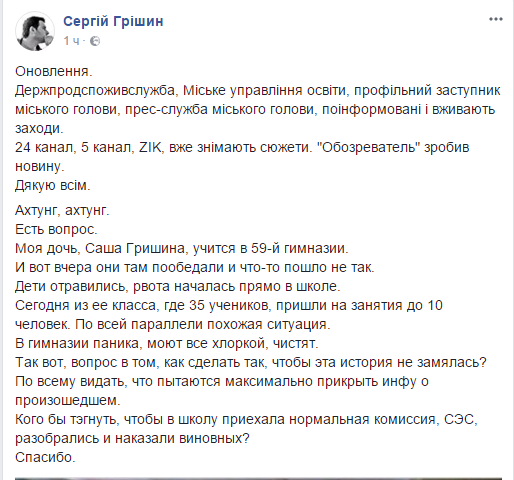 "Моя дочь учится в 59-й гимназии. Вчера они там пообедали, и что-то пошло не так. Дети отравились, рвота началась еще в школе. Сегодня из ее класса, где 35 учеников, пришли на занятия до 10 человек. По всей параллели похожа ситуация. В гимназии паника, моют все хлоркой, чистят", - написал Гришин.