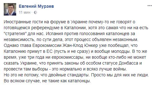 Депутат Евгений Мураев: "Иностранные гости на форуме в Украине почему-то не говорят о готовящемся референдуме в Каталонии, хотя это самая что ни на есть "стратегия" для нас. Испания против голосования каталонцев за независимость, по сути дела, этот процесс объявлен незаконным. Однако глава Еврокомиссии Жан-Клод Юнкер уже пообещал, что Каталонию примут в ЕС (пусть и не сразу) и вообще молодцы. В то же время, уже три года ни еврокомиссары, ни вообще кто-либо не может сказать Украине, что принять законы об особом статусе Донбасса и провести там выборы - это нормально и всяко лучше войны.