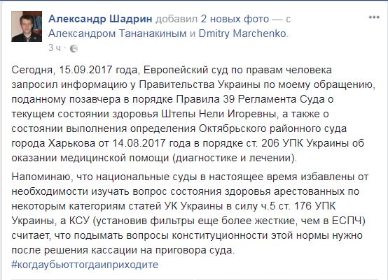 "Европейский суд по правам человека запросил информацию у правительства Украины по моему обращению, поданному позавчера в порядке Правила 39 Регламента Суда о текущем состоянии здоровья Штепы Нели Игоревны, а также о состоянии выполнения определения Октябрьского районного суда города Харькова об оказании медицинской помощи (диагностике и лечении)", - написал Шадрин.