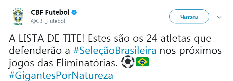 "Эти 24 спортсмена, которые будут защищать #SeleçãoBrasileira (сборную Бразилии - прим.) в предстоящих отборочных матчах. #Гиганты по природе", - говорится в опубликованном сообщении.