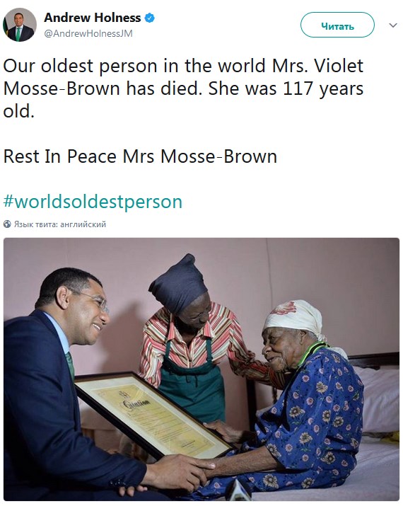 На Ямайке умерла старейшая жительница Земли Вайолет Мосс-Браун. Об этом сообщает пресс-служба премьер-министра Ямайки Эндрю Холнесса в Тwitter.