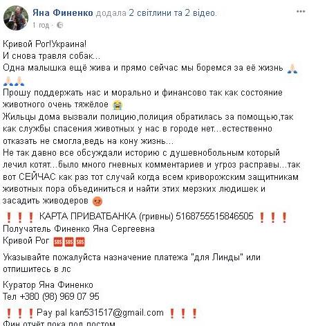 Сегодня, 16 сентября, на микрорайоне Карачуны в Центрально-Городском районе Кривого Рога неизвестные отравили нескольких собак. Об этом на своей странице в Facebook сообщает зоозащитница Яна Финенко.