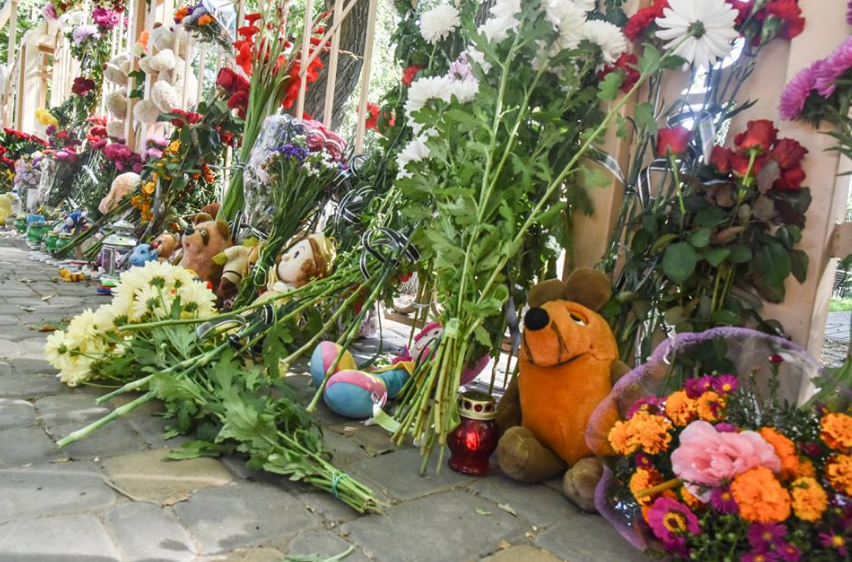 Спустя сутки после пожара, во время которого погибли трое детей, одесситы несут цветы и игрушки к месту их гибели в оздоровительном лагере "Виктория".