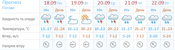Ресурс Мeteoprog.ua обещает осадки со среды по субботу. А первые два дня рабочей недели будут солнечными. Воздух днем прогреется до +21...+24. В четверг будет наблюдаться пик жары +29.