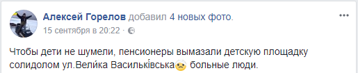 "Чтобы дети не шумели, пенсионеры измазали детскую площадку солидолом. Больные люди", - написал Горелов.