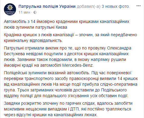"Патрульные получили вызов о том, что по переулку Александра Бестужева неизвестные украли с десяток крышек канализационных люков. Заявители также сообщили, в каком направлении двинулись вероятные воры на автомобиле Mercedes-Benz. Полицейские остановили указанный автомобиль. Во время поверхностной проверки транспортного средства правоохранители обнаружили 14 крышек от канализационных люков. На место происшествия прибыла следственно-оперативная группа. Трех задержанных мужчин доставили в Подольское отделение полиции для дальнейшего выяснения всех обстоятельств происшествия", - говориться в сообщении.