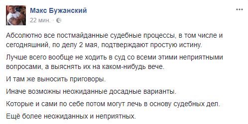 Макс Бужанский, блогер: "Абсолютно все постмайданные судебные процессы, в том числе и сегодняшний, по делу 2 мая, подтверждают простую истину. Лучше всего вообще не ходить в суд со всеми этими неприятными вопросами, а выяснять их на каком-нибудь вече. И там же выносить приговоры. Иначе возможны неожиданные досадные варианты. Которые и сами по себе потом могут лечь в основу судебных дел. Ещё более неожиданных и неприятных".