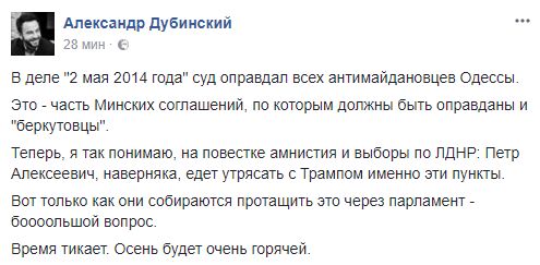 Александр Дубинский, журналист, финансовый эксперт: "В деле "2 мая 2014 года" суд оправдал всех антимайдановцев Одессы. Это - часть Минских соглашений, по которым должны быть оправданы и "беркутовцы". Теперь, я так понимаю, на повестке амнистия и выборы по ЛДНР: Петр Алексеевич, наверняка, едет утрясать с Трампом именно эти пункты. Вот только как они собираются протащить это через парламент - боооольшой вопрос. Время тикает. Осень будет очень горячей".