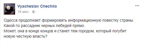Вячеслав Чечило, журналист: "Одесса продолжает формировать информационную повестку страны. Какой-то рассадник черных лебедей прямо. Может, она в конце концов и станет тем городом, который погубит новую честную власть?"