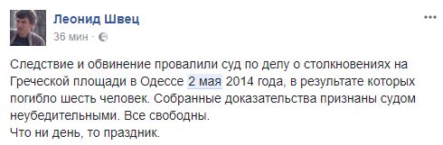 Леонид Швец, журналист: "Следствие и обвинение провалили суд по делу о столкновениях на Греческой площади в Одессе 2 мая 2014 года, в результате которых погибло шесть человек. Собранные доказательства признаны судом неубедительными. Все свободны. Что ни день, то праздник".
