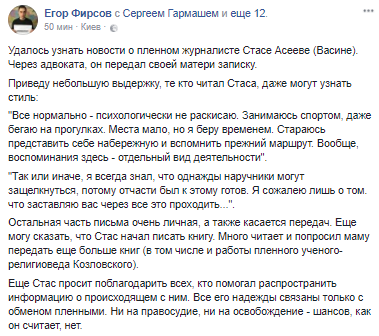 "Удалось узнать новости о пленном журналисте Стасе Асееве (Васине). Через адвоката, он передал своей матери записку", - сообщает Фирсов.
