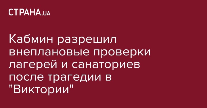 Кабинет министров на сегодняшнем заседании после смертельного пожара в одесском детском лагере "Виктория" разрешил ГосЧС проводить внеплановые проверки дошкольных и общеобразовательных учреждений, учреждений здравоохранения, домов для престарелых людей с целью контроля за пожарной и техногенной безопасностью. Об этом сообщает "112 Украина".