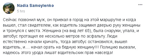 "Когда он вышел - стал свидетелем, как водитель прищемил дверью руку женщины и тронулся с места. Женщина, на вид лет 65-и лет, была снаружи, упала, и автобус протянул ее несколько метров по асфальту", - говорится в сообщении.