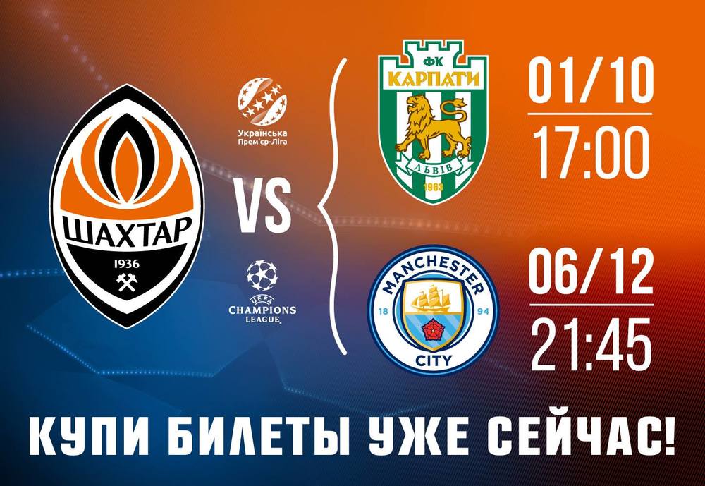 "Приобрести билеты на матч "Шахтер" – "Манчестер Сити" теперь можно онлайн! Вы можете это сделать на сайтах-партнерах, покупая их вместе с билетами на игру с "Карпатами", – говорится в Facebook "Шахтера".