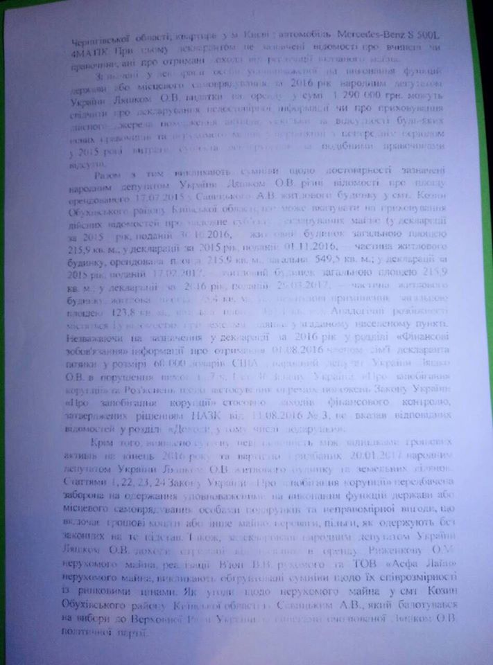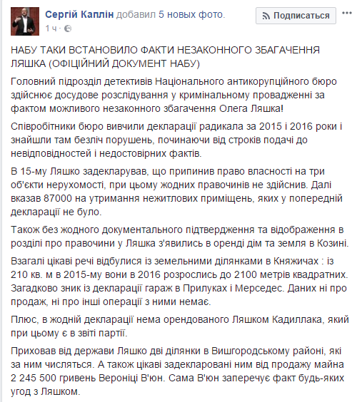 "Сотрудники бюро изучили декларации радикала 2015 и 2016 годы и нашли множество нарушений, начиная от сроков подачи к несоответствий и недостоверных фактов. В 15-м Ляшко задекларировал, что прекратил право собственности на три объекта недвижимости, при этом никаких сделок не осуществил. Далее указал 87 000 грн на содержание нежилых помещений, которые в предыдущей декларации не было. Также без всякого документального подтверждения и отражения в разделе о сделках у Ляшко появились данные  об аренде дом и земли в Козине. Вообще интересные вещи произошли с земельными участками в Княжичах: с 210 кв. м в 2015-м они в 2016 разрослись до 2100 квадратных метров. Загадочно исчез из декларации гараж в Прилуках и Мерседес. Данных ни о продаже, ни о других операциях с ними нет. Плюс, в одной декларации нет арендованного Ляшко Кадиллака, который при этом  появляется  в отчете партии", - написал Каплин.