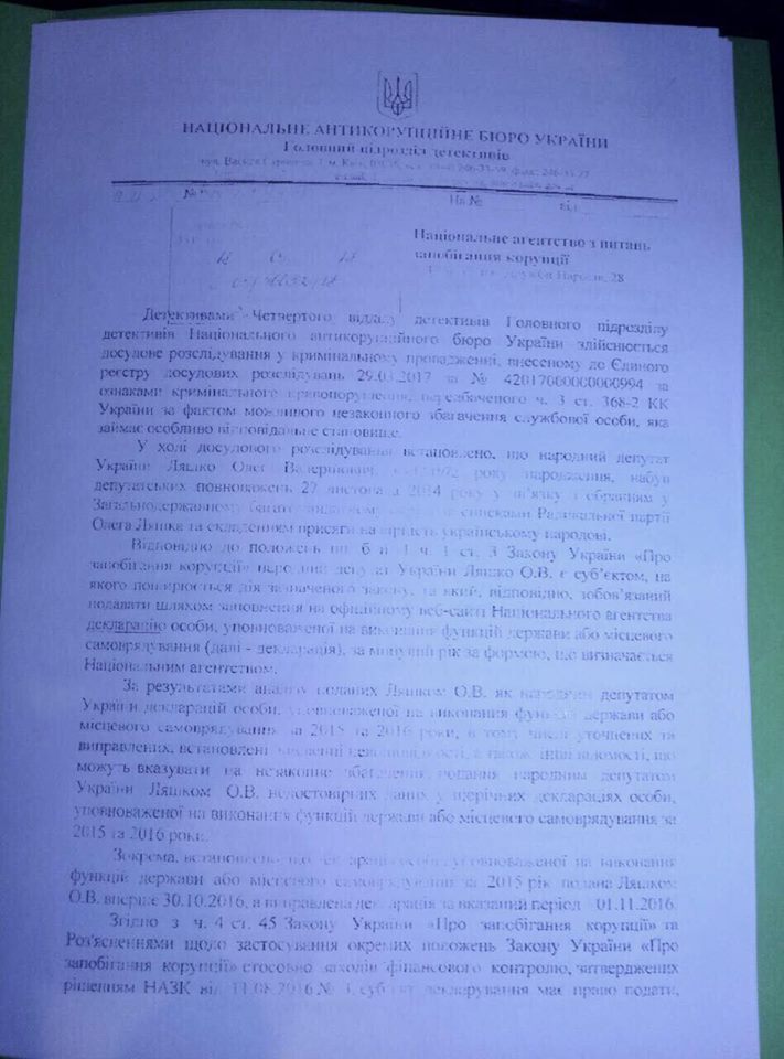 Народный депутат Сергей Каплин заявил, что НАБУ установило факт незаконного обогащения Ляшко. Об этом Каплин написал в своем Facebook и приложил скан-копии документов.